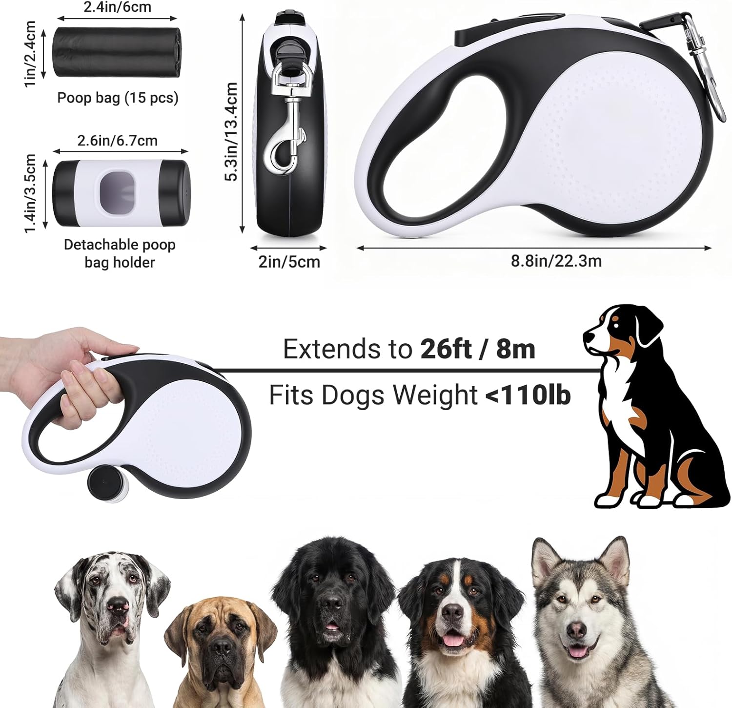26 Ft Walking Leash with Poop Bag Holder for Dogs Weighing 66 lbs – 110 lbs, 8m Retractable Heavy-Duty Leash 360°Tangle-Free with Anti-Slip Handle One-Handed Brake Pause Lock for Pet Outside