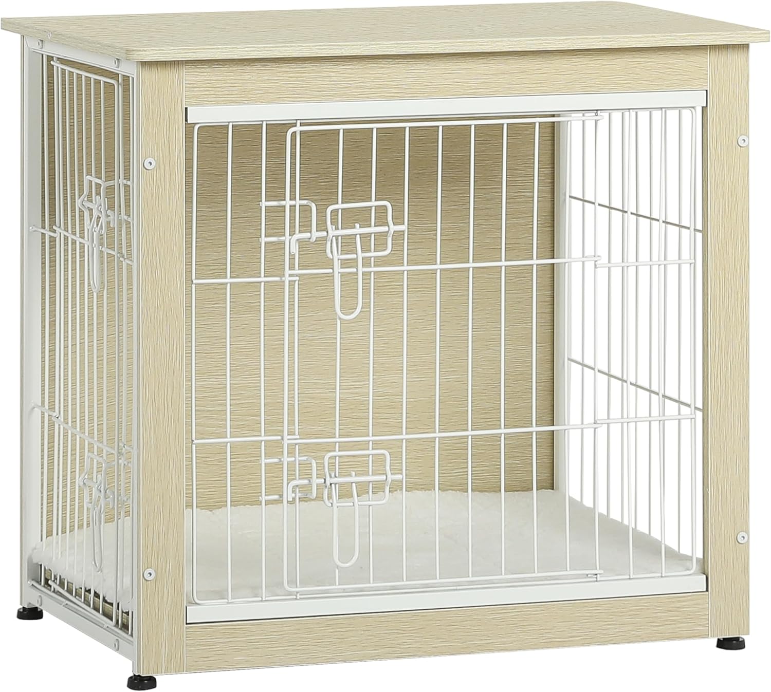 Dog Crate Furniture with Cushion, Wooden Kennel Table with Double Doors, Indoor Dog House, Small/Medium/Large Size, 27.2″ L, White Oak